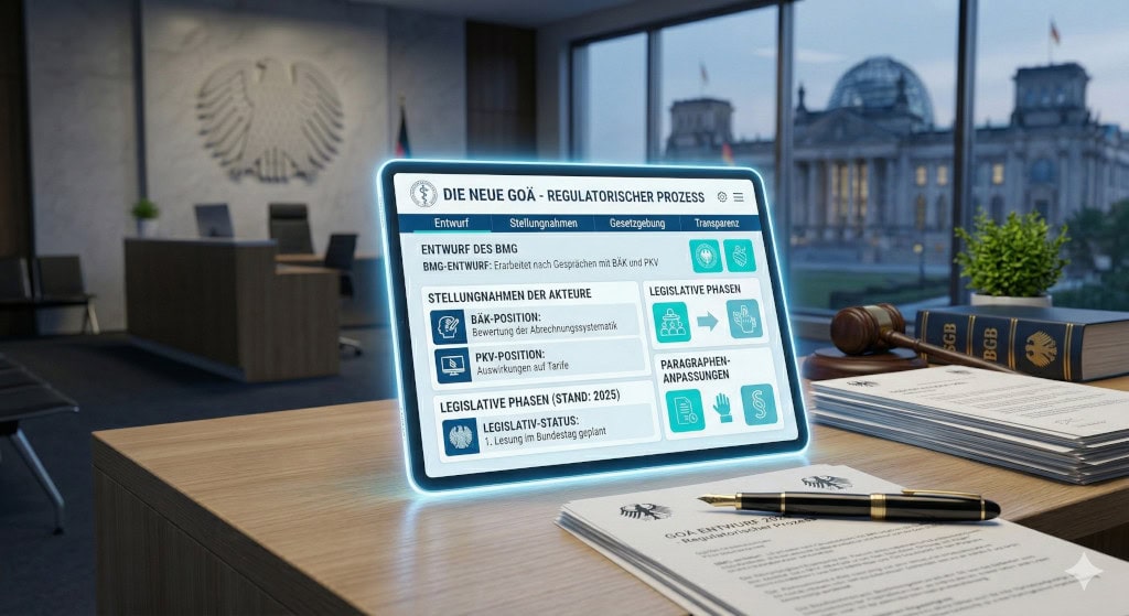 Dazu braucht es neben der Neufassung der GOÄ selbst auch eine Änderung von § 11 BÄO sowie weitere gesetzliche Anpassungen, etwa im SGB V. Der Entwurf ist eine Vorlage für den Verordnungsgeber — kein Abrechnungsinstrument.
