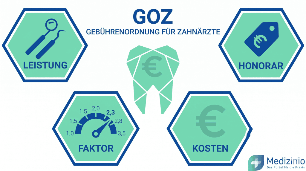 • Die Gebührenordnung für Zahnärzte (GOZ) regelt die Vergütung privatzahnärztlicher Leistungen auf Basis von Punktzahl, Punktwert (5,62421 Cent) und Steigerungsfaktor (1,0- bis 3,5-fach); der 2,3-fache Gebührensatz gilt nach § 5 Abs. 2 GOZ als Schwellenwert für die durchschnittliche Leistung.