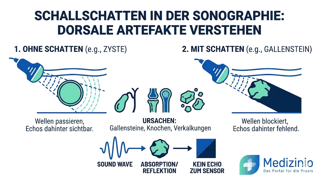 - Der Schallschatten ist das diagnostisch bedeutendste dorsale Artefakt in der Sonographie – entstanden durch Absorption, Reflexion oder Totalreflexion – und ermöglicht bei korrekter Interpretation die Diagnose von Cholelithiasis und Nephrolithiasis mit einer Sensitivität und Spezifität von über 95 % (Gallensteine ab 2 mm).