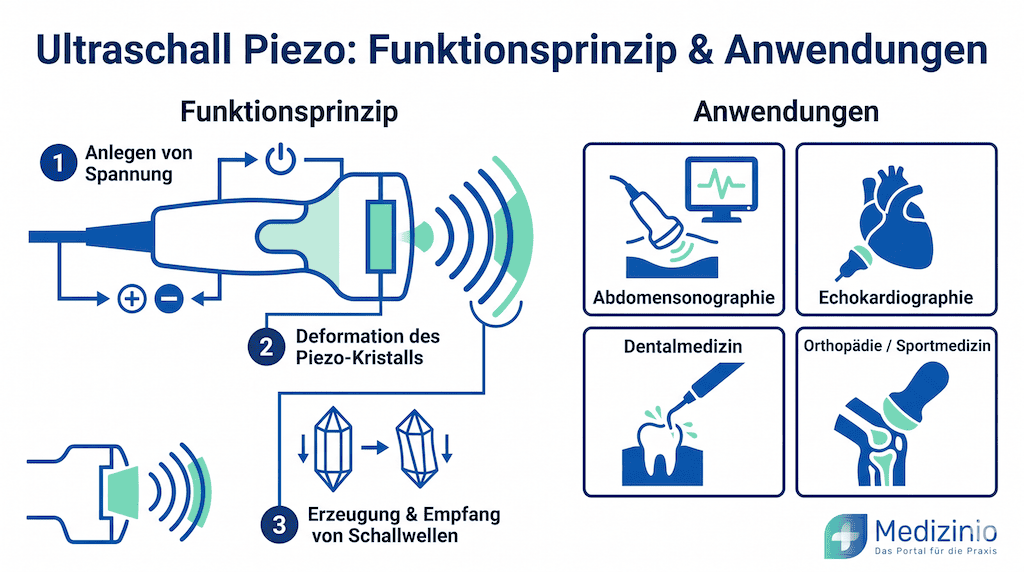 - Piezoelektrische Wandler (Ultraschall Piezo) bilden die physikalische Basis aller modernen Ultraschall-Diagnostik und industriellen Schalltechnik: Der direkte Piezoeffekt wandelt Schallwellen in elektrische Signale (Empfang), der inverse Piezoeffekt erzeugt aus elektrischen Signalen mechanische Schwingungen (Senden) – beide Effekte laufen im selben Bauteil ab.